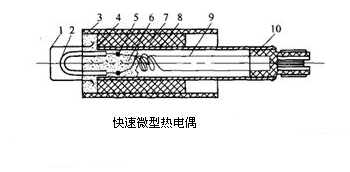快速微型热电偶,这是一种用来测量钢水、铁水或其他熔融金属温度的热电偶,其结构如下图所示。因为一个热电偶只使用一次,故又称消耗式热电偶。由于这种热电偶所有材料大多廉价,即使是贵金属热电偶,但铂铭一铂丝极细,用址不大,总的来说价格还是便宜的,这就是钢厂广泛使用的原因。