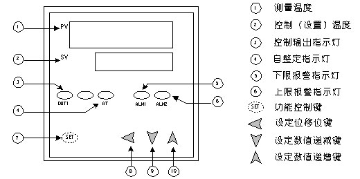 2、 控制(设置)温度显示屏:(SV)在正常工作时,显示控制(设置)温度值;在进行参数设置时,显示各项参数的数值;