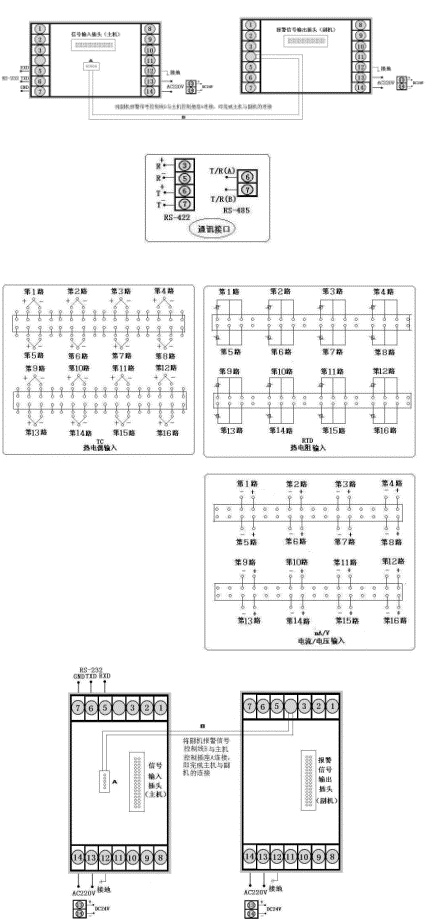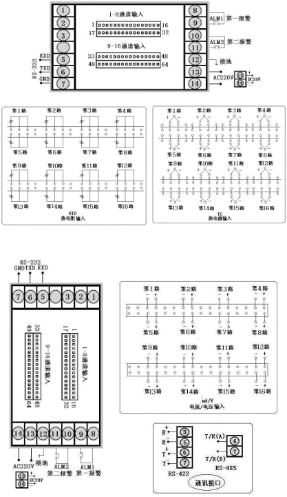十六路巡检统一控制/报警输出,通讯方式为RS-232,输出方式为继电器输入,输入类型为Pt100,第一报警为上限报警,第二报警为下限报警,带报警保持功能,DC24V供电,竖表。 |