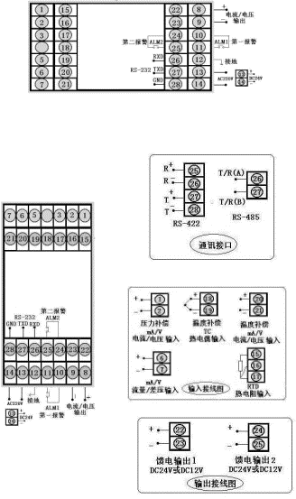 | 带补偿输入,通讯方式RS-232,输出方式为继电器输出,输入类型为第一路0~10 mA,第二路1~5V,第一报警为上限报警,第二报警为下限报警,单路DC24V馈电输出,DC24V供电,竖表。 |