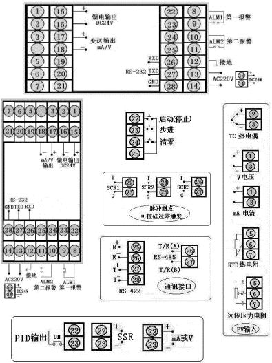 | 通讯方式为RS-485,输出方式为继电器输出,输入类型为Pt100,第一报警为下限报警,第二报警为上限报警,DC24V馈电输出,AC90~265V供电(开关电源),横表。 |