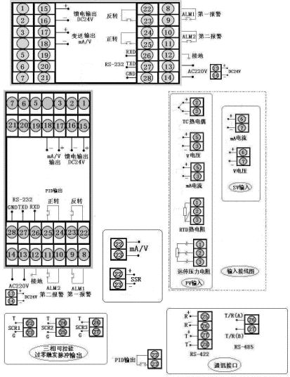 | 通讯方式为RS-232,输出方式为继电器输出,输入类型为Pt100.1,第一报警为上限报警,第二报警为下限报警,DC24V馈电输出,DC24V供电,竖表。 |