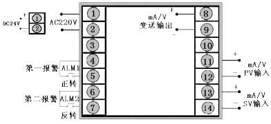 输出方式为继电器正反转输出,PV输入类型为4~20 mA,SV输入类型1~5 V,DC24V供电。 |