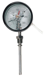 | 电接点双金属温度计是利用温度变化时带动触点变化,当其与上下限触点接触或断开的同时,使电路中的继电器动作,从而自动控制和报警。 |